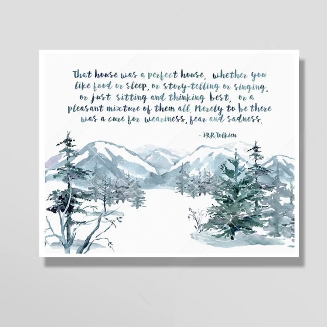 "That house was a perfect house, whether you like food or sleep or story-telling or singing, or just sitting and thinking best, or a pleasant mixture of them all.' Merely to be there was a cure for weariness, fear, and sadness." J. R. R. Tolkien Quote Art print.